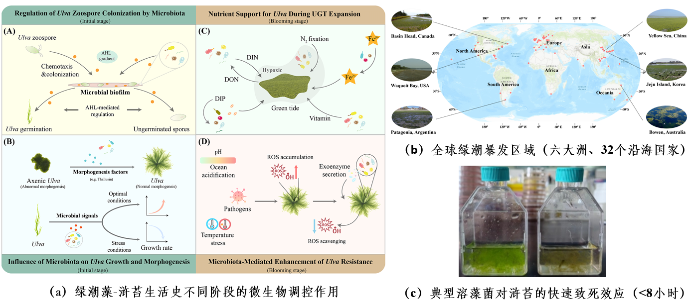 绿潮灾害目前已蔓延至全球32个国家,我国黄海也连续19年遭遇该灾害。目前已知绿潮暴发过程与机制归因于气候、环境和人类活动等多种因素,但对微观尺度上与浒苔紧密关联的微生物群落的调控作用了解甚少。面对浒苔绿潮这一日益严峻的全球海洋生态灾害,建立高效防控和治理方案成为全球迫切需求。近日,青岛能源所系统解析了绿潮并非单纯的浒苔暴发,而是气候与环境等多种驱因下,浒苔与细菌、古菌、病毒、真菌等微生物构成的“全...