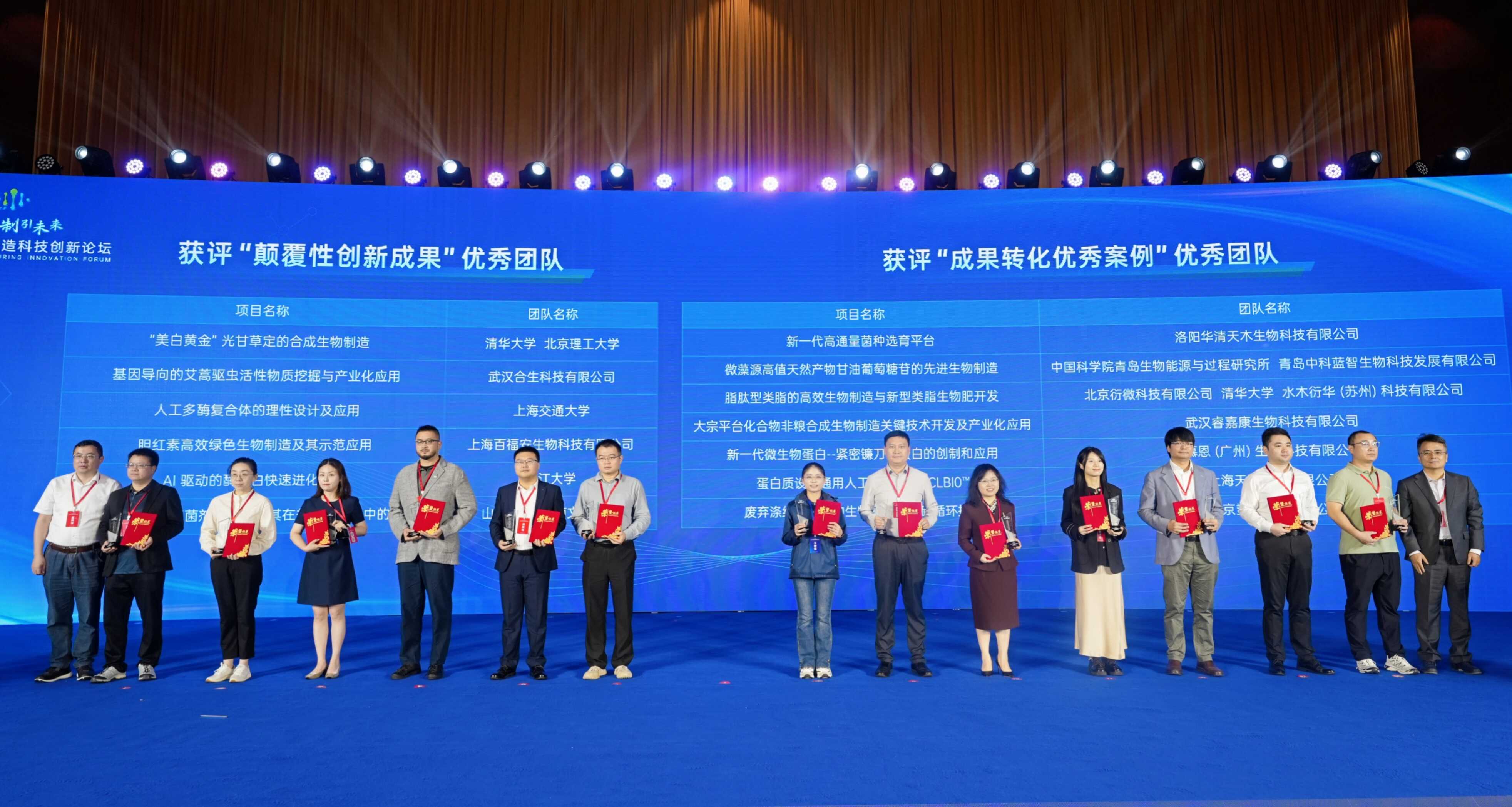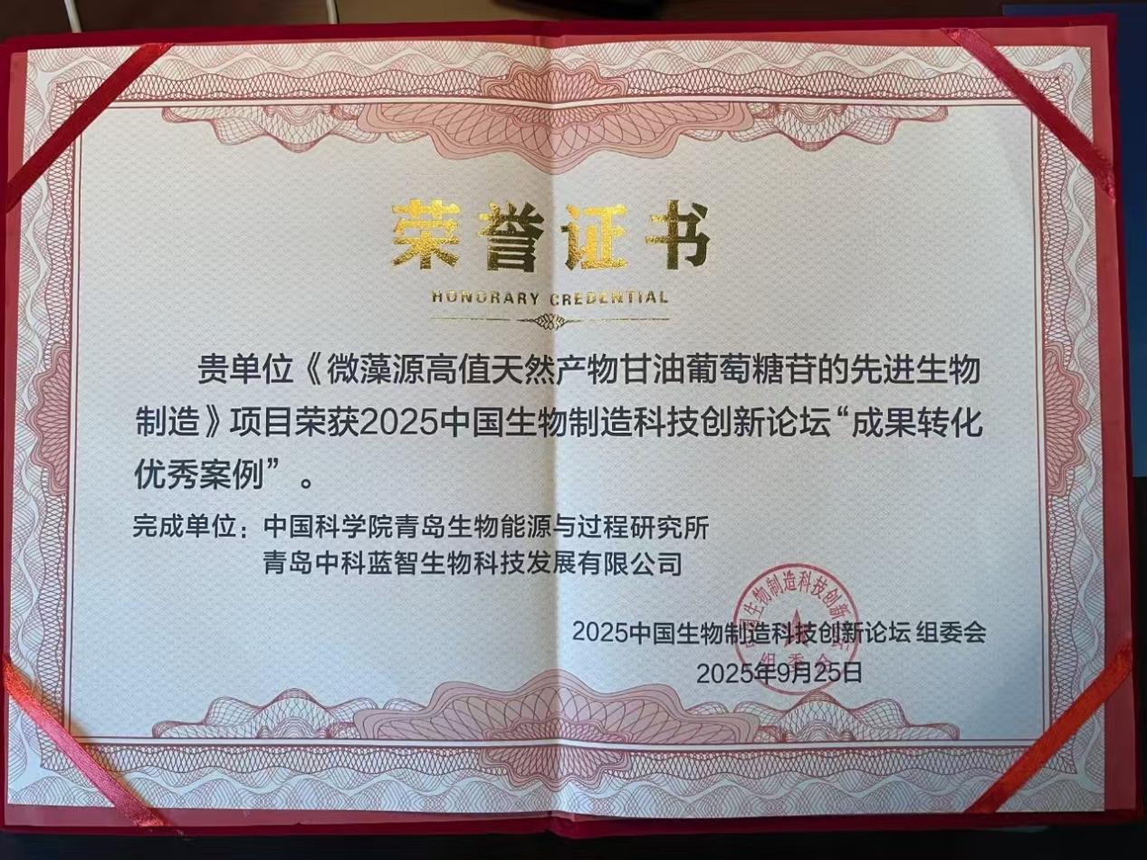 为促进生物制造技术创新成果转化落地,论坛前期组织征集评议并在会议期间正式发布“2025生物制造颠覆性创新成果和成果转化优秀案例”榜单。青岛能源所与青岛中科蓝智生物科技发展有限公司(以下简称“中科蓝智”)的合作成果“微藻源高值天然产物甘油葡糖苷的先进生物制造”成功入选并获评“成果转化优秀案例”(共7项),成为微藻领域唯一入选项目,彰显该成果在技术创新性、产业成熟度与社会效益方面的广泛认可度。