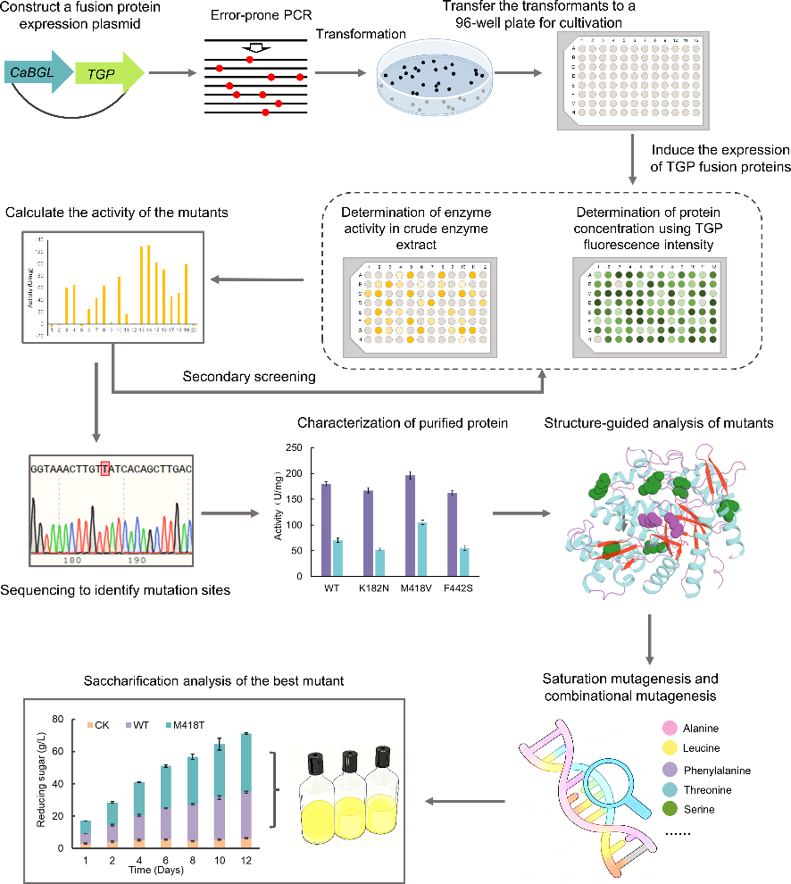 图1 CaBGL的酶工程改造策略:基于TGP融合的高通量筛选和基于结构的半理性设计相结合