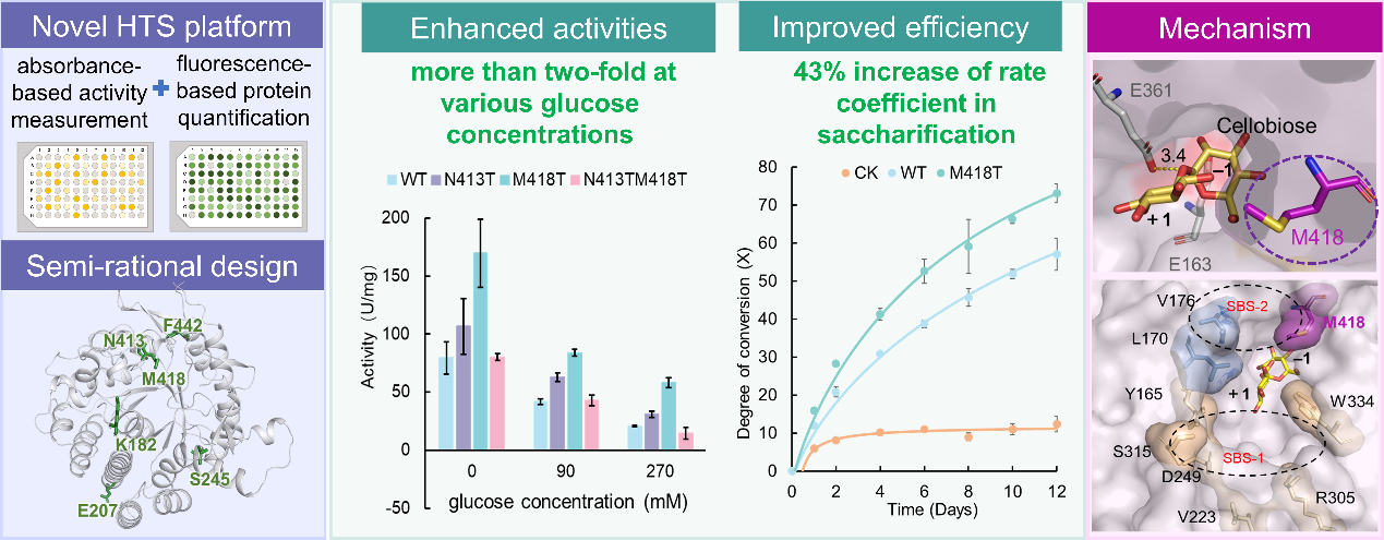 使用该策略,研究团队构建了包含6000个转化子的突变体库,经过初筛和复筛,成功获得了3个具有活性显著提升的突变体。对突变体上的活性位点进行饱和突变和组合突变,最终筛选到一个性能最优的突变体M418T。研究表明,在不同浓度(0-675 mM)葡萄糖存在的情况下,M418T的催化活性均比野生型酶提高两倍以上。在体外与天然纤维小体复配进行纤维素糖化实验中,M418T将糖化速率系数显著提升了43%。