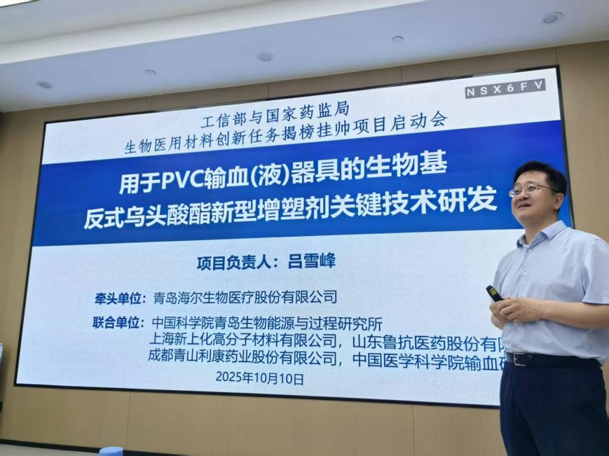 10月10日,工信部与国家药监局联合组织的生物医用材料创新任务揭榜挂帅项目“用于PVC输血(液)器具的生物基反式乌头酸酯新型增塑剂关键技术研发”项目启动会暨医用PVC材料科技攻关突击队会师活动在青岛举行。该项目由青岛海尔生物医疗股份有限公司牵头,联合青岛能源所、上海新上化高分子材料有限公司、山东鲁抗医药股份有限公司、成都青山利康药业股份有限公司、中国医学科学院输血研究所,组建“原料-材料-制品-评价”协同创新联合体,共同承担揭榜挂帅攻关任务,旨在解决医用PVC材料中邻苯类增塑剂因健康危害亟需替代而又难以替代的产业困境。